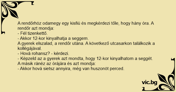 A rendőrhöz odamegy egy kisfiú és megkérdezi tőle, hogy hány óra. A rendőr azt mondja: