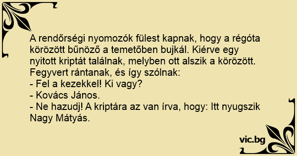 A rendőrségi nyomozók fülest kapnak, hogy a régóta körözött bűnöző a temetőben bujkál. Kiérve egy nyitott kriptát találnak, melyben ott alszik a körözött. Fegyvert rántanak, és így szólnak: