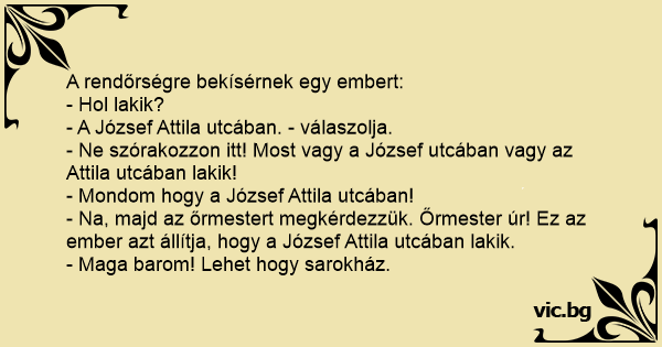 - Na, majd az őrmestert megkérdezzük. Őrmester úr! Ez az ember azt állítja, hogy a József Attila utcában lakik.