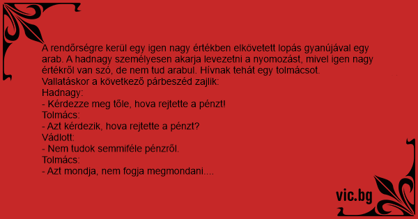 A rendőrségre kerül egy igen nagy értékben elkövetett lopás gyanújával egy arab. A hadnagy személyesen akarja levezetni a nyomozást, mivel igen nagy értékről van szó, de nem tud arabul. Hívnak tehát egy tolmácsot.