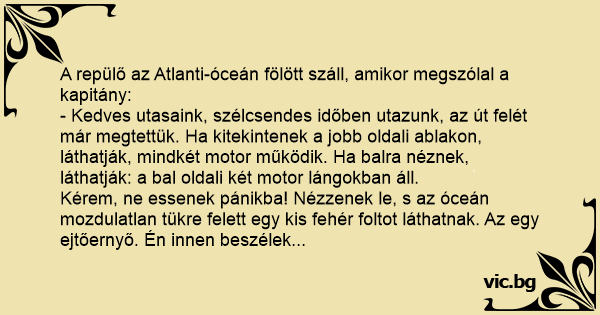 A repülő az Atlanti-óceán fölött száll, amikor megszólal a kapitány: - Kedves utasaink, szélcsendes időben utazunk, az út felét már megtettük. Ha kitekintenek a jobb oldali ablakon, láthatják, mindkét motor működik. Ha balra néznek, láthatják: a bal oldali két motor lángokban áll. Kérem, ne essenek pánikba! Nézzenek le, s az óceán mozdulatlan tükre felett egy kis fehér foltot láthatnak. Az egy ejtőernyő. Én innen beszélek...