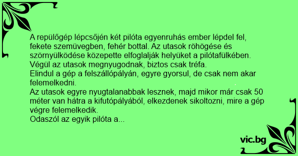 Felszállás előtt a repülő utasai csodálkozva látják, hogy a kapitány egy vakvezető kutyával, fekete szemüvegben, fehér bottal botladozik a pilótafülke felé. Először mindenki arra gondol, hogy...