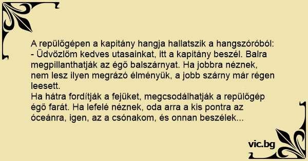 - Üdvözlöm kedves utasainkat, itt a kapitány beszél. Balra megpillanthatják az égő balszárnyat. Ha jobbra néznek, nem lesz ilyen megrázó élményük, a jobb szárny már régen leesett.