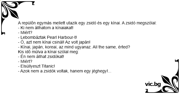 A repülőn egymás mellett utazik egy zsidó és egy kínai. A zsidó megszólal: