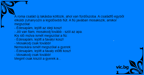 A roma család új lakásba költözik, ahol van fürdőszoba. A családfő egyből elküldi zuhanyozni a legidősebb fiút. A fiú javában mosakszik, amikor megszólal: