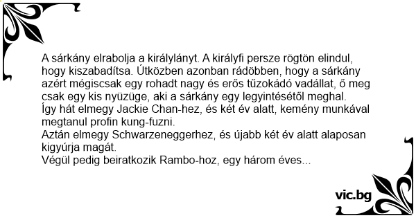 A sárkány elrabolja a királylányt. A királyfi persze rögtön elindul, hogy kiszabadítsa. Útközben azonban rádöbben, hogy a sárkány azért mégiscsak egy rohadt nagy és erős tűzokádó vadállat, ő meg csak egy kis nyüzüge, aki a sárkány egy legyintésétől meghal.