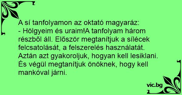 - Hölgyeim és uraim!A tanfolyam három részből áll. Először megtanítjuk a sílécek felcsatolását, a felszerelés használatát. Aztán azt gyakoroljuk, hogyan kell lesiklani. És végül megtanítjuk önöknek, hogy kell mankóval járni.