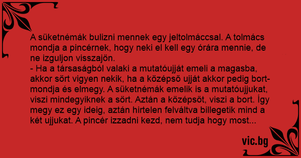 - Ha a társaságból valaki a mutatóujját emeli a magasba, akkor sört vigyen nekik, ha a középső ujját akkor pedig bort- mondja és elmegy. A süketnémák emelik is a mutatóujjukat, viszi mindegyiknek a sört. Aztán a középsőt, viszi a bort. Így megy ez egy ideig, aztán hirtelen felváltva billegetik mind a két ujjukat. A pincér izzadni kezd, nem tudja hogy most mit is kérnek. Szerencsére az utolsó pillanatban megjön a jeltolmács.