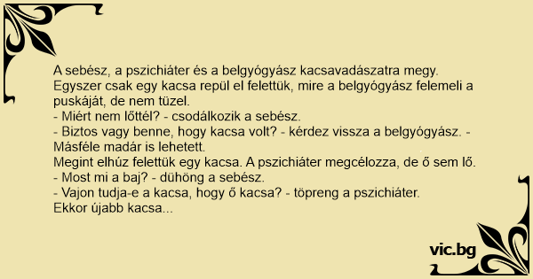 - Biztos vagy benne, hogy kacsa volt? - kérdezi a belgyógyász és a pszichiáter.