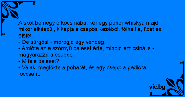 A skót bemegy a kocsmába, kér egy pohár whiskyt, majd mikor elkészül, kikapja a csapos kezéből, fölhajtja, fizet és elsiet.