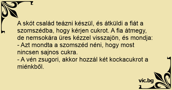 A skót család teázni készül, és átküldi a fiát a szomszédba, hogy kérjen cukrot. A fia átmegy, de nemsokára üres kézzel visszajön, és mondja: