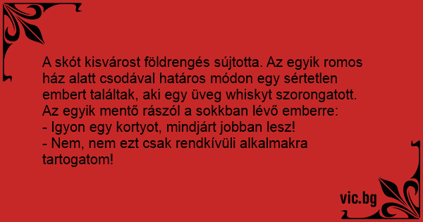 A skót kisvárost földrengés sújtotta. Az egyik romos ház alatt csodával határos módon egy sértetlen embert találtak, aki egy üveg whiskyt szorongatott. Az egyik mentő rászól a sokkban lévő emberre: - Igyon egy kortyot, mindjárt jobban lesz! - Nem, nem ezt csak rendkívüli alkalmakra tartogatom!