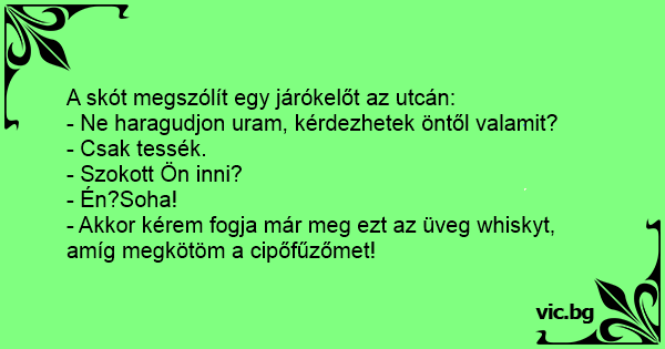- Akkor kérem fogja már meg ezt az üveg whiskyt, amíg megkötöm a cipőfűzőmet!