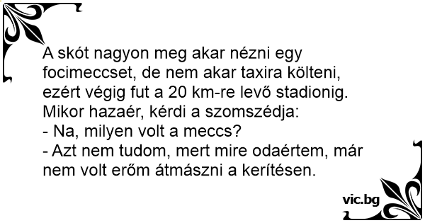 A skót nagyon meg akar nézni egy focimeccset, de nem akar taxira költeni, ezért végig fut a 20 km-re levő stadionig. Mikor hazaér, kérdi a szomszédja: