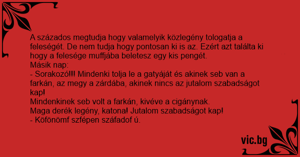 A százados megtudja hogy valamelyik közlegény tologatja a feleségét. De nem tudja hogy pontosan ki is az. Ezért azt találta ki hogy a felesége muffjába beletesz egy kis pengét.