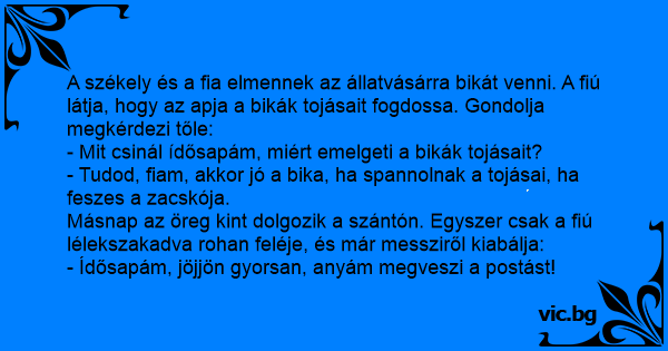 A székely és a fia elmennek az állatvásárra bikát venni. A fiú látja, hogy az apja a bikák tojásait fogdossa. Gondolja megkérdezi tőle: