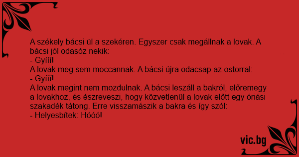 A székely bácsi ül a szekéren. Egyszer csak megállnak a lovak. A bácsi jól odasóz nekik: