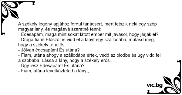 - Drága fiam! Először is vidd el a lányt egy szállodába, mutasd meg, hogy a székely tehetős.
