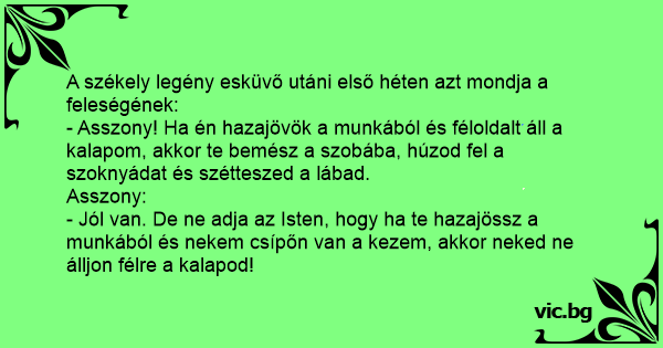 - Asszony! Ha én hazajövök a munkából és féloldalt áll a kalapom, akkor te bemész a szobába, húzod fel a szoknyádat és szétteszed a lábad.