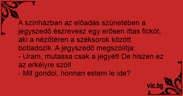 A színházban az előadás szünetében a jegyszedő észrevesz egy erősen ittas fickót, aki a nézőtéren a széksorok között botladozik. A jegyszedő megszólítja: