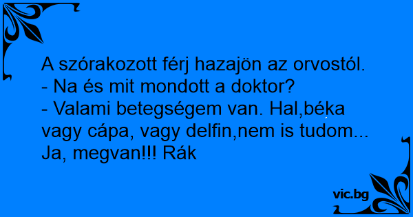 - Valami betegségem van. Hal,béka vagy cápa, vagy delfin,nem is tudom... Ja, megvan!!! Rák