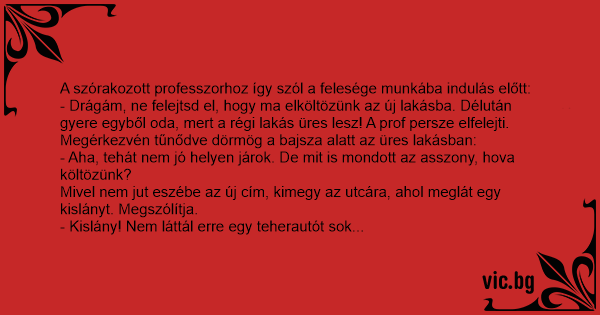 - Drágám, ne felejtsd el, hogy ma elköltözünk az új lakásba. Délután gyere egyből oda, mert a régi lakás üres lesz! A prof persze elfelejti. Megérkezvén tűnődve dörmög a bajsza alatt az üres lakásban:
