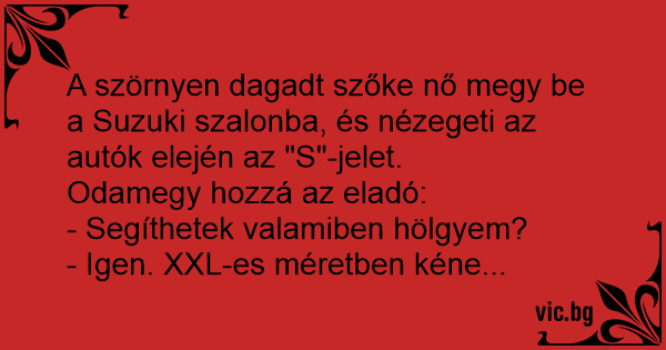 A szörnyen dagadt szőke nő megy be a Suzuki szalonba, és nézegeti az autók elején az "S"-jelet.