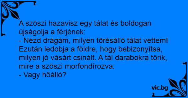 A szöszi hazavisz egy tálat és boldogan újságolja a férjének: