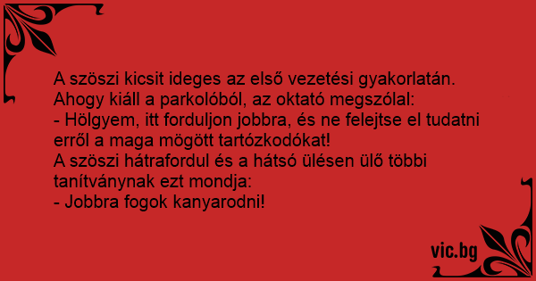 A szöszi kicsit ideges az első vezetési gyakorlatán. Ahogy kiáll a parkolóból, az oktató megszólal: