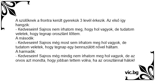 - Kedveseim! Sajnos nem írhatom meg, hogy hol vagyok, de tudatom veletek, hogy tegnap oroszlánt lőttem.