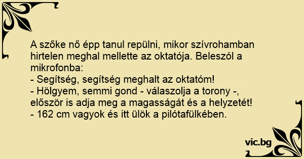 - Hölgyem, semmi gond - válaszolja a torony -, először is adja meg a magasságát és a helyzetét!