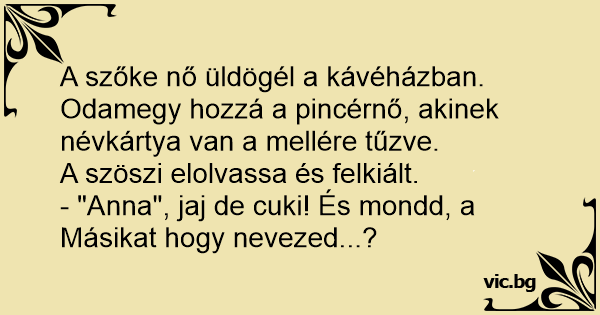 Odamegy hozzá a pincérnő, akinek névkártya van a mellére tűzve.