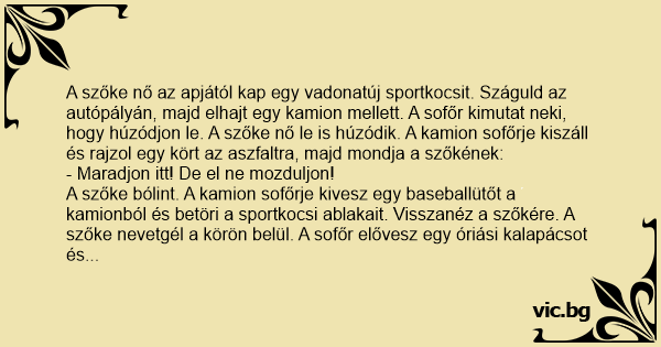 A szőke bólint. A kamion sofőrje kivesz egy baseballütőt a kamionból és betöri a sportkocsi ablakait. Visszanéz a szőkére. A szőke nevetgél a körön belül. A sofőr elővesz egy óriási kalapácsot és szétveri a sportkocsi motorháztetejét. A szőke harsányan nevet a körön belül. A kamion sofőrje már nagyon ideges. Előveszi a bicskáját és kilyukasztja a sportkocsi összes gumiját. A szőke fetrengve röhög a körön belül. Mire a sofőr megkérdezi a szőkét: