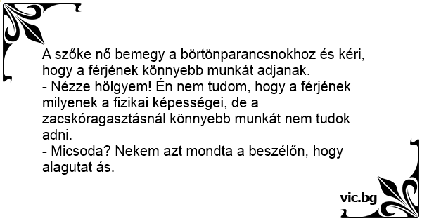 - Nézze hölgyem! Én nem tudom, hogy a férjének milyenek a fizikai képességei, de a zacskóragasztásnál könnyebb munkát nem tudok adni.