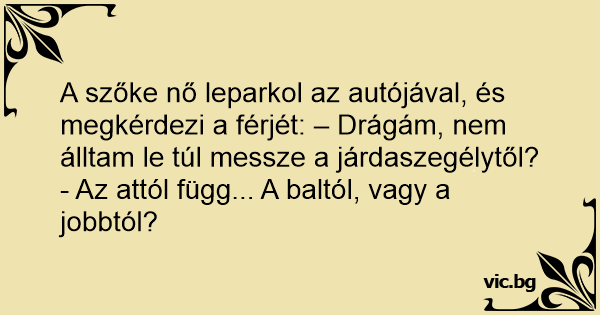 A szőke nő leparkol az autójával, és megkérdezi a férjét: – Drágám, nem álltam le túl messze a járdaszegélytől?