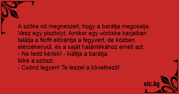 A szőke nő megneszeli, hogy a barátja megcsalja. Vesz egy pisztolyt. Amikor egy vöröske karjaiban találja a férfit előrántja a fegyvert, de közben elérzékenyül, és a saját halántékához emeli azt.