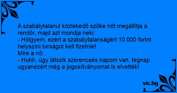 - Huhh, úgy látszik szerencsés napom van, tegnap ugyanezért még a jogosítványomat is elvették!
