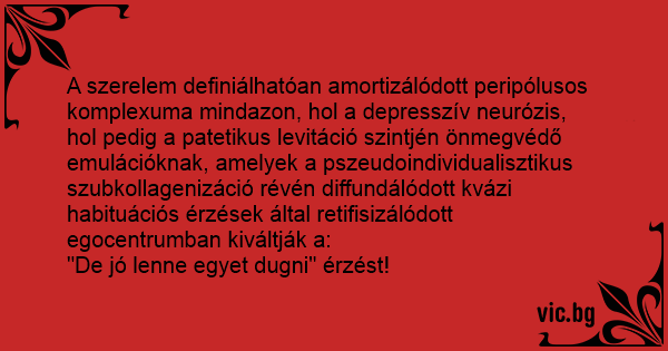 A szerelem definiálhatóan amortizálódott peripólusos komplexuma mindazon, hol a depresszív neurózis, hol pedig a patetikus levitáció szintjén önmegvédő emulációknak, amelyek a pszeudoindividualisztikus szubkollagenizáció révén diffundálódott kvázi habituációs érzések által retifisizálódott egocentrumban kiváltják a: