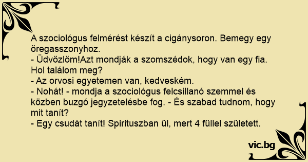 A szociológus felmérést készít a cigánysoron. Bemegy egy öregasszonyhoz.