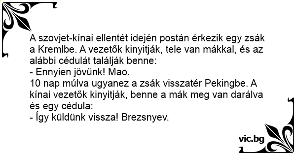 A szovjet-kínai ellentét idején postán érkezik egy zsák a Kremlbe. A vezetők kinyitják, tele van mákkal, és az alábbi cédulát találják benne: