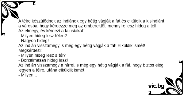 A télre készülődnek az indiánok egy hétig vágják a fát és elküldik a kisindiánt a városba, hogy kérdezze meg az emberektől, mennyire lesz hideg a tél!