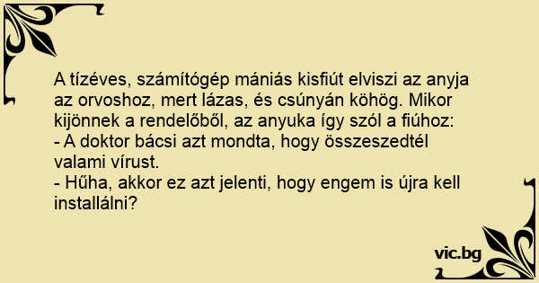 A tízéves, számítógép mániás kisfiút elviszi az anyja az orvoshoz, mert lázas, és csúnyán köhög. Mikor kijönnek a rendelőből, az anyuka így szól a fiúhoz: