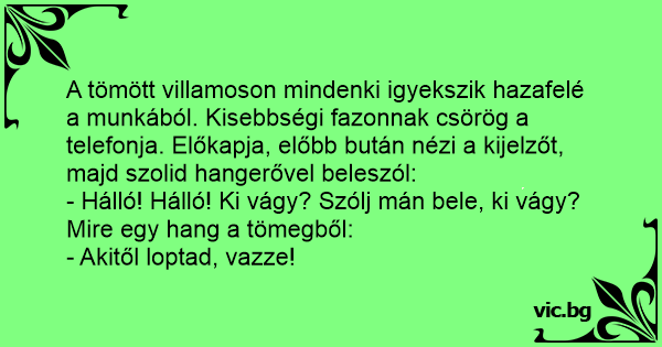 A tömött villamoson mindenki igyekszik hazafelé a munkából. Kisebbségi fazonnak csörög a telefonja. Előkapja, előbb bután nézi a kijelzőt, majd szolid hangerővel beleszól: