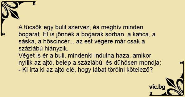 Véget is ér a buli, mindenki indulna haza, amikor nyílik az ajtó, belép a százlábú, és dühösen mondja: