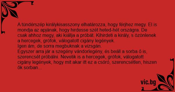 Egyszer arra jár a szegény vándorlegény, és beáll a sorba ő is, szerencsét próbálni. Nevetik is a hercegek, grófok, válogatott cigány legények, hogy mit akar itt ez a csóró, szerencsétlen, hiszen ők sorban kudarcot vallottak.