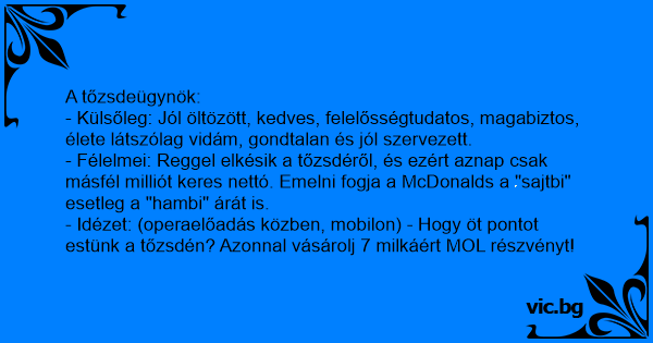 - Idézet: (operaelőadás közben, mobilon) - Hogy öt pontot estünk a tőzsdén? Azonnal vásárolj 7 milkáért MOL részvényt!