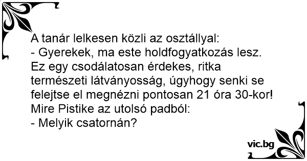 - Gyerekek, ma este holdfogyatkozás lesz. Ez egy csodálatosan érdekes, ritka természeti látványosság, úgyhogy senki se felejtse el megnézni pontosan 21 óra 30-kor!