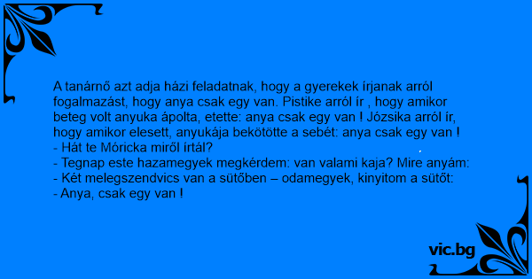 A tanárnő azt adja házi feladatnak, hogy a gyerekek írjanak arról fogalmazást, hogy anya csak egy van. Pistike arról ír , hogy amikor beteg volt anyuka ápolta, etette: anya csak egy van ! Józsika arról ír, hogy amikor elesett, anyukája bekötötte a sebét: anya csak egy van !