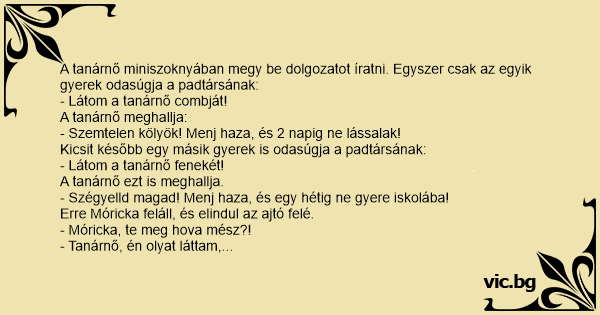 A tanárnő miniszoknyában megy be dolgozatot íratni. Egyszer csak az egyik gyerek odasúgja a padtársának:
