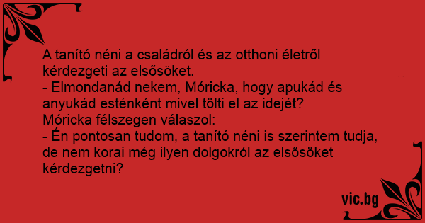- Én pontosan tudom, a tanító néni is szerintem tudja, de nem korai még ilyen dolgokról az elsősöket kérdezgetni?